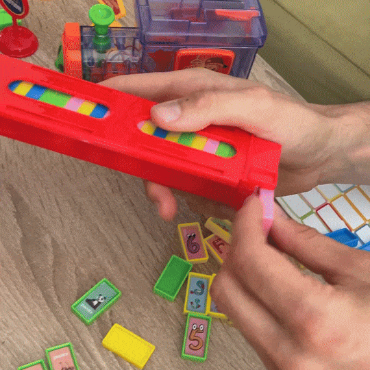 Jednostavno napunite gornji deo dominama i pustite vozić da obavi sav težak posao slaganja.