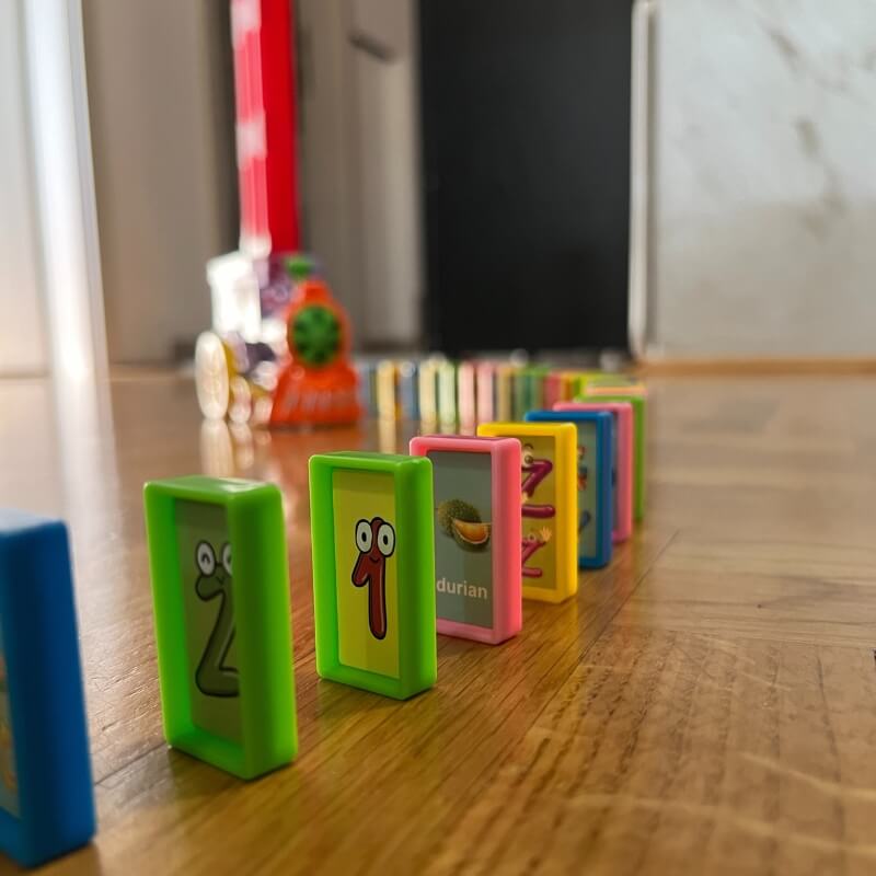 Na domine se zalepe slike životinja, boja, brojeva, predmeta i ostalih pojmova koje dete prepoznaje i ponavlja kako vozić slaže jednu po jednu.