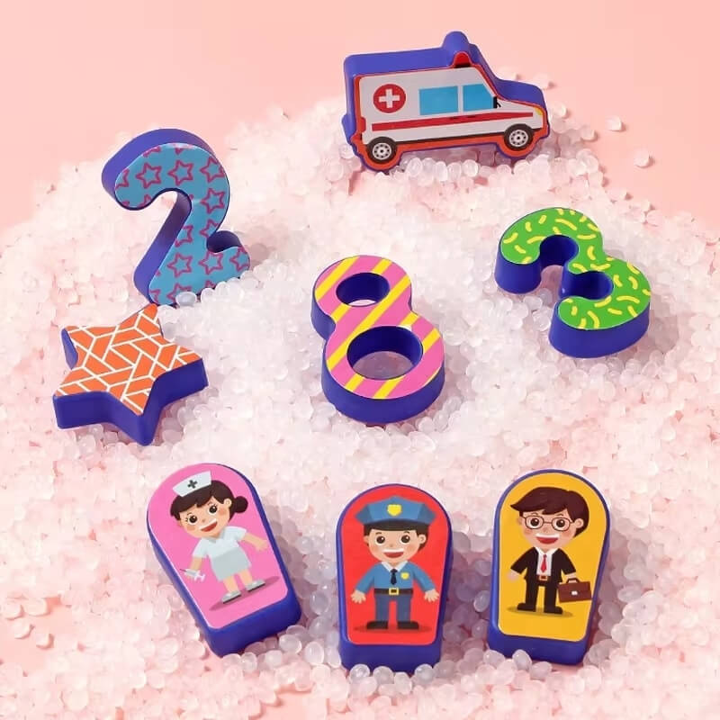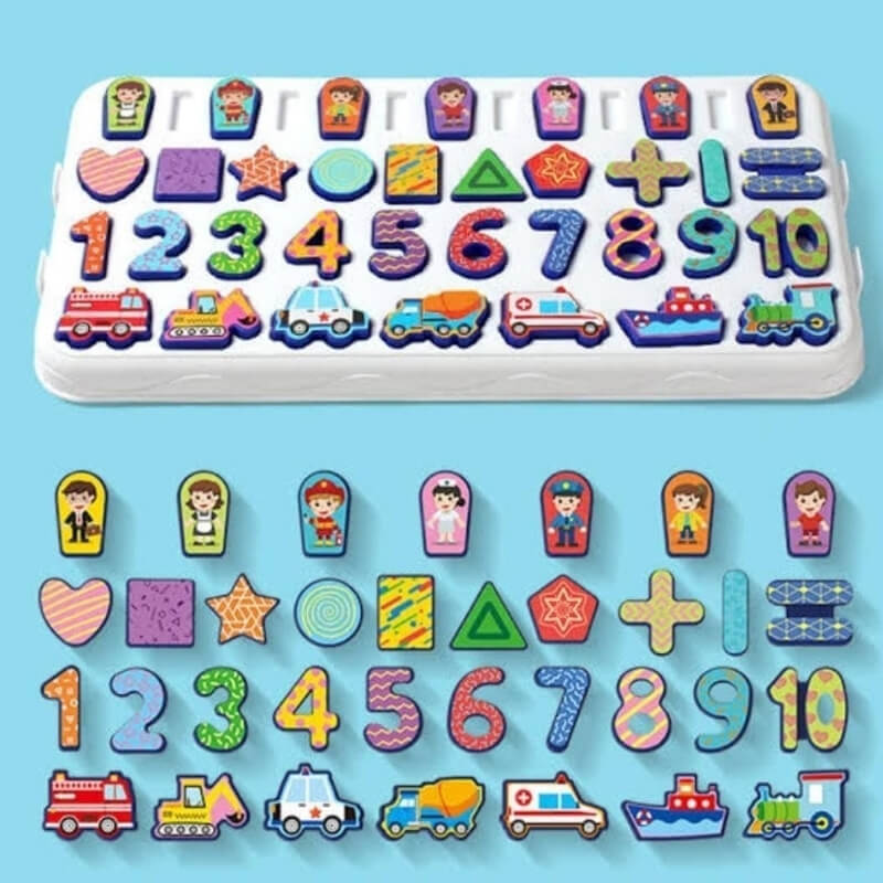 Set sadrži tablu sa otvorima za lako slaganje i organizaciju figura, kao i različite šarene brojeve, oblike i vozila.