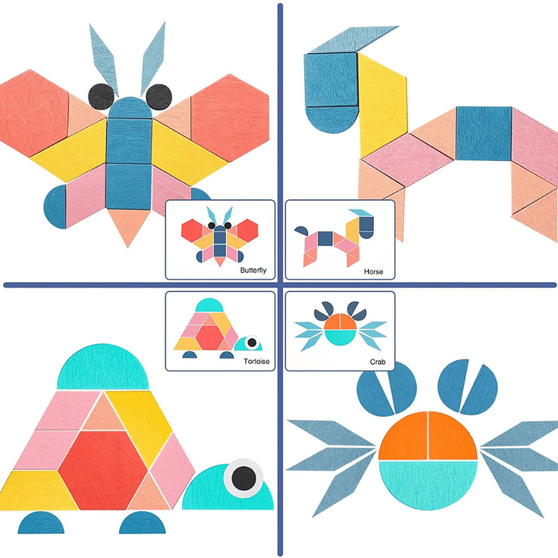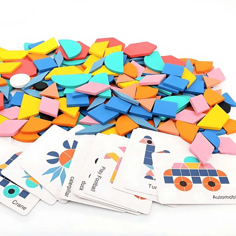 U setu pored kartica pronaćićete drvene puzle. To su 180 različitih delova, u više nijansi boja i oblika.